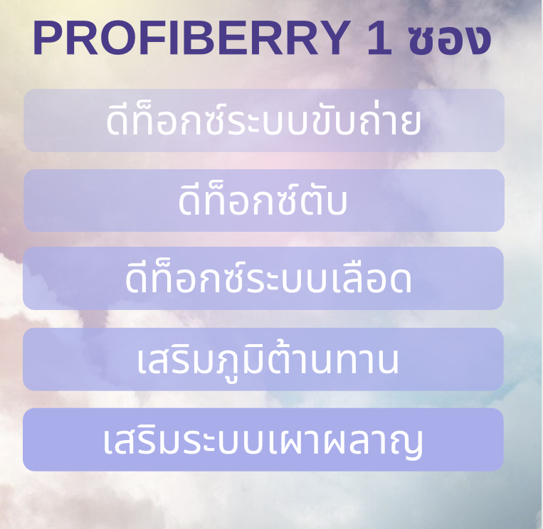 PROFIBERRY ประกอบไปด้วย ProDURA โพรไบโอติก จุลินทรีย์มีประโยชน์จากสหรัฐอเมริกา มีคุณสมบัติทนต่อกรดในกระเพาะ ให้ผลดีในการรักษาสมดุลลำไส้ มีผลงานวิจัยทางการแพทย์ระดับสากลรองรับถึง 38 ฉบับ